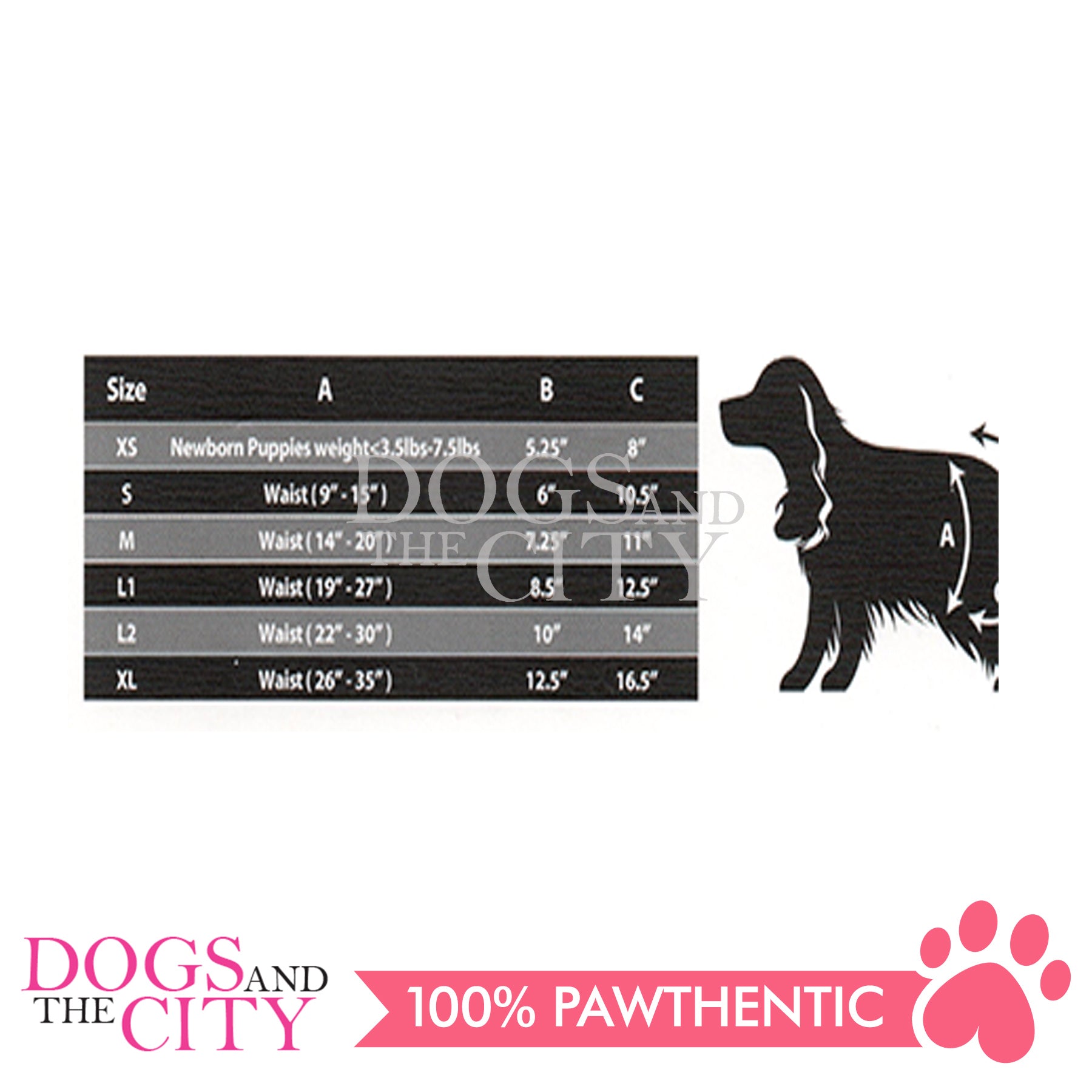 - Please refer to the size guide posted in the additional photos to check the best size for your pet. Ensure you measure your dog's waist right in front of the back legs to achieve a perfect fit.