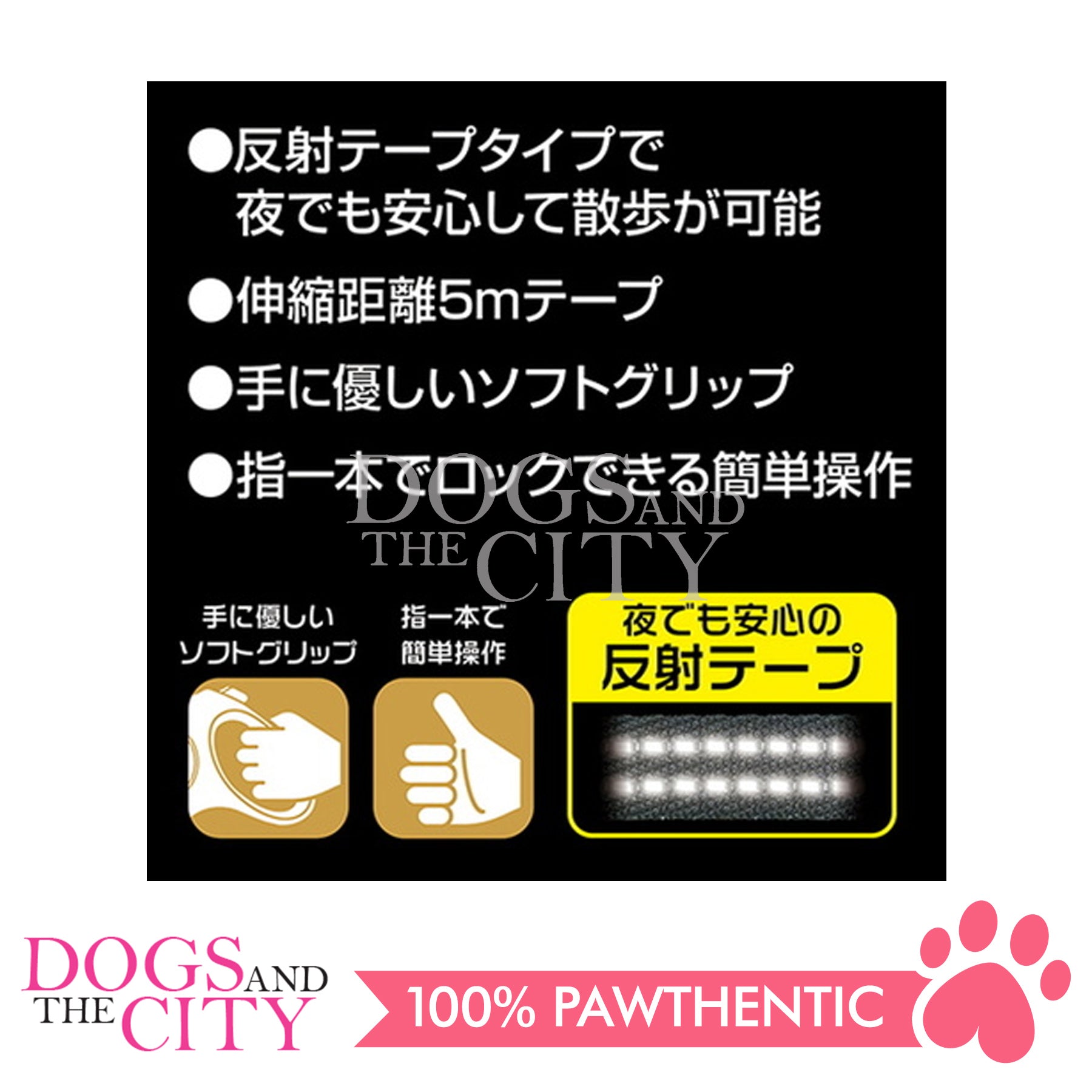 Retractable lead for tape type of walk. We also adopt reflective tape which is safe even at night, soft grip which is gentle to the hand. For medium size dogs up to 20 kg. The extension distance is 5 m.