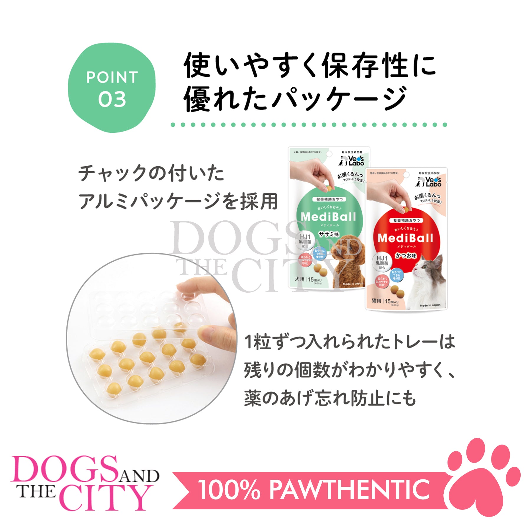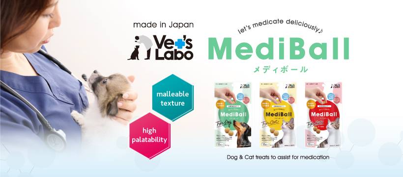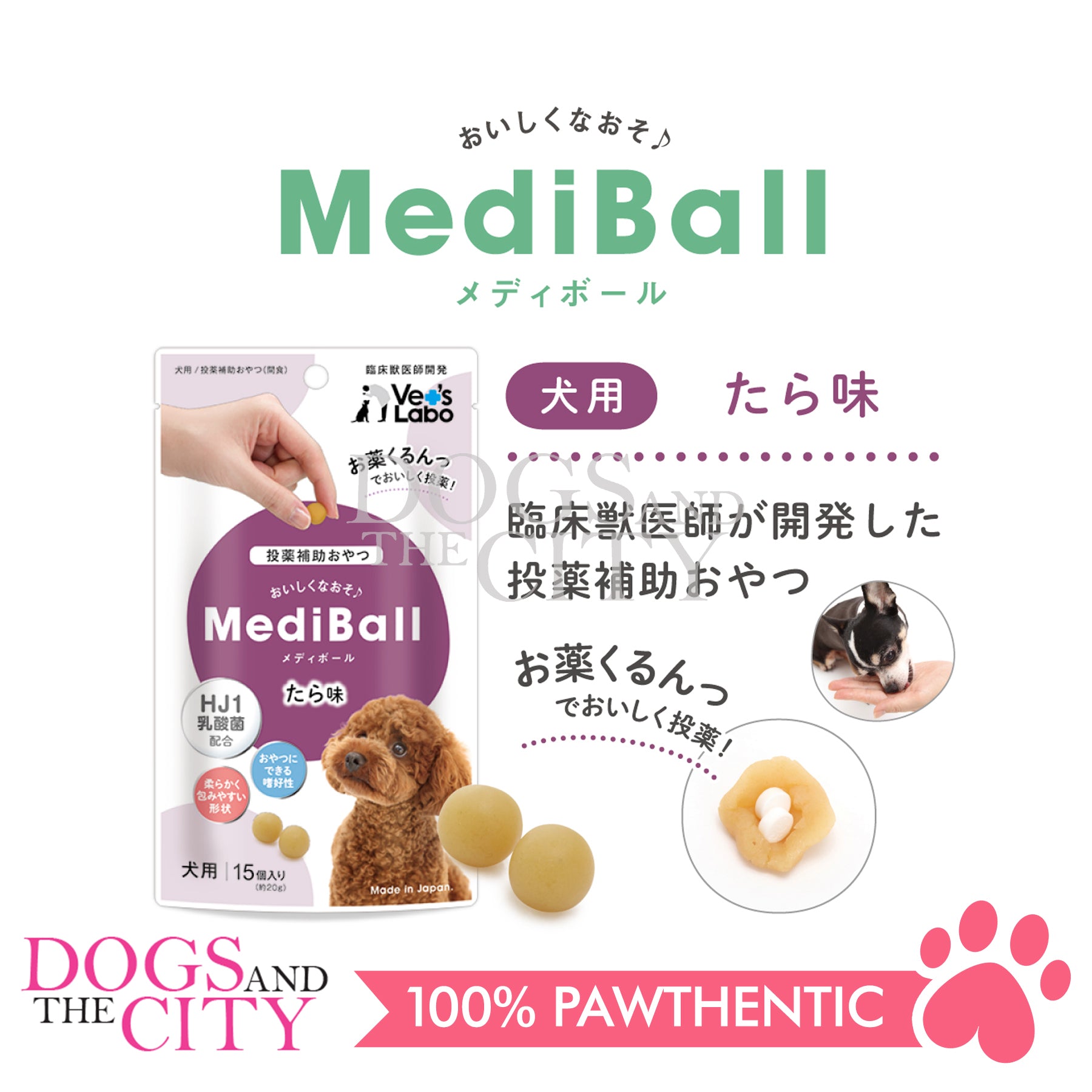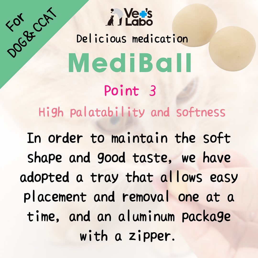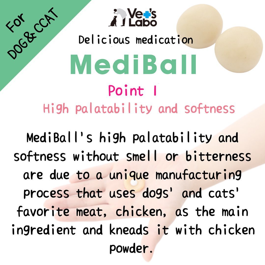 - Easy-to-wrap size and shape: MediBall is a soft ball-shaped treat with a diameter of approximately 1 cm. It is designed in a size and shape that makes it easy to wrap and give both tablets and powdered medications. Use two Medi Balls when wrapping a medicine that is too large to be wrapped in a single Medi Ball. If the medication is given twice a day, one bag can be used for one week's worth of medication. Please be careful not to touch the MediBall with hands that have touched the medication. The smell of the medication may be transferred to the MediBall and its palatability may decrease.