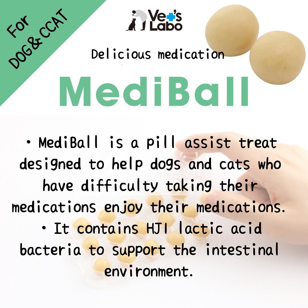 - Easy-to-wrap size and shape: MediBall is a soft ball-shaped treat with a diameter of approximately 1 cm. It is designed in a size and shape that makes it easy to wrap and give both tablets and powdered medications. Use two Medi Balls when wrapping a medicine that is too large to be wrapped in a single Medi Ball. If the medication is given twice a day, one bag can be used for one week's worth of medication. Please be careful not to touch the MediBall with hands that have touched the medication. The smell of the medication may be transferred to the MediBall and its palatability may decrease.